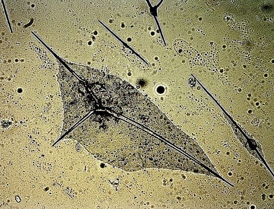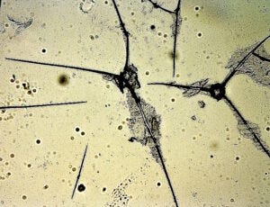 Microscopic thorns and needle structures within fluid of afflicted skin of individual above.